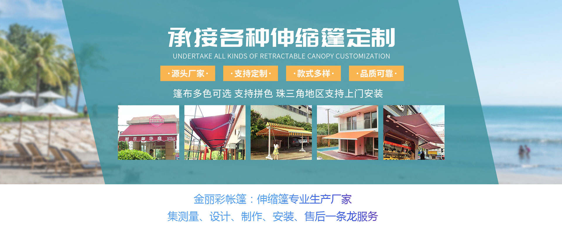 中山市金麗彩帳篷有限公司成立于2002年,是一家集遮陽(yáng)篷配件生產(chǎn)、批發(fā)戶外休閑用品的專業(yè)彩蓬安裝制做工程公司,在廣東地區(qū)擁有大量彩樣板工程實(shí)例,公司技術(shù)力量成熟,專注承接定制制作安裝各種遮陽(yáng)、遮雨、固定或活動(dòng)蓬、展覽蓬、鋁合金無(wú)線遙控電動(dòng)蓬、廣告蓬、歐式造型蓬、戶外休閑傘等產(chǎn)品。本公司還可以根據(jù)用戶需求制作各款大型戶外停車場(chǎng)帳蓬、款式新穎、質(zhì)量可靠、價(jià)格實(shí)惠。公司位于中國(guó)廣東省中山市沙溪鎮(zhèn),交通方便,物流快捷。金麗彩帳篷本著“客戶為先,誠(chéng)信至上”的原則,熱誠(chéng)歡迎各界朋友前來(lái)我司參觀、考察、洽談業(yè)務(wù)。
